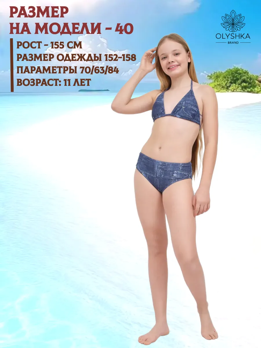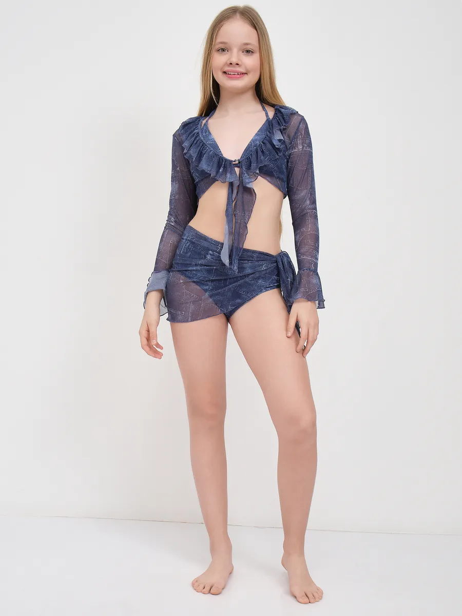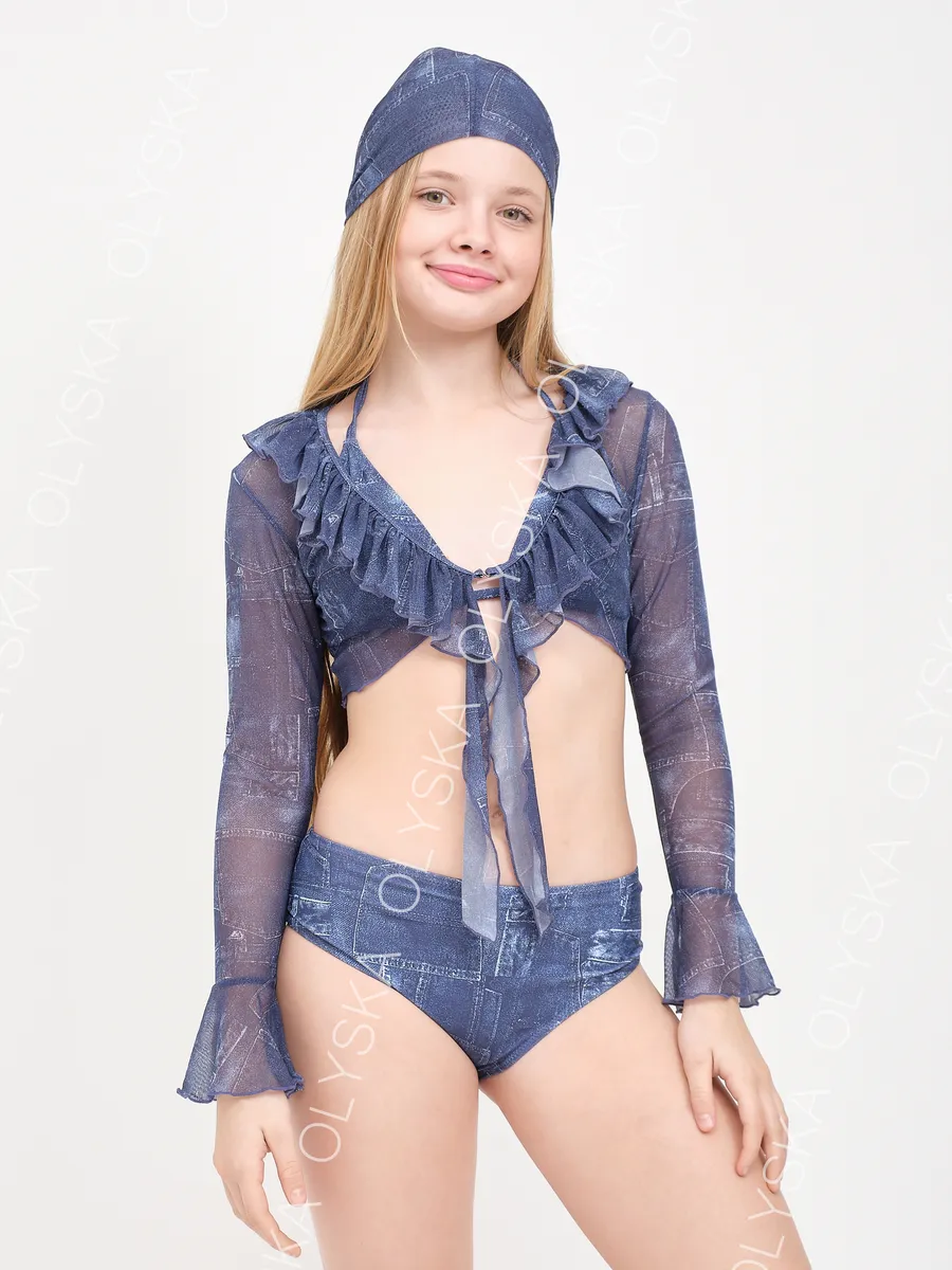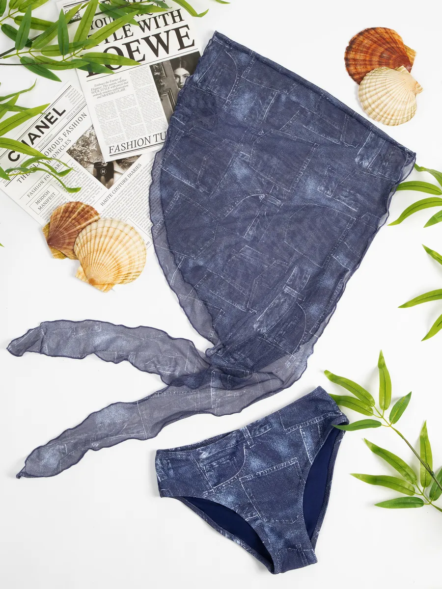 Раздельный купальник с модным принтом под джинсу и лёгкой накидкой — это стиль, комфорт и защита от солнца в одном комплекте. Купальник легко регулируется завязками и подходит как для пляжного отдыха, так и для занятий плаванием.