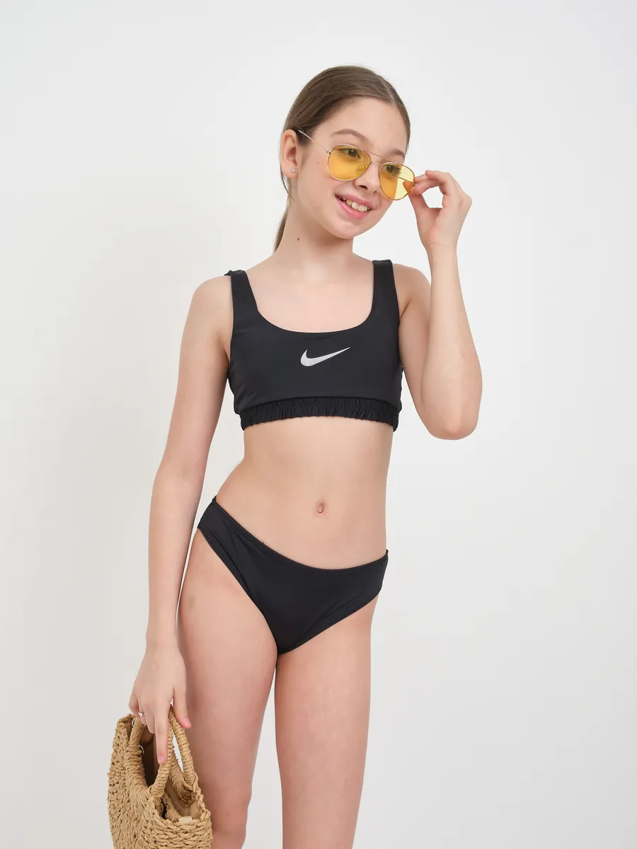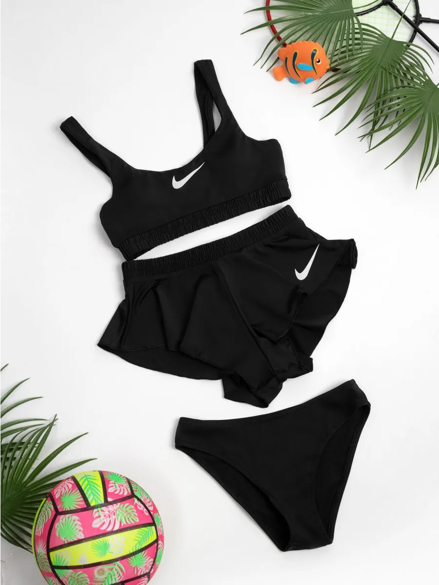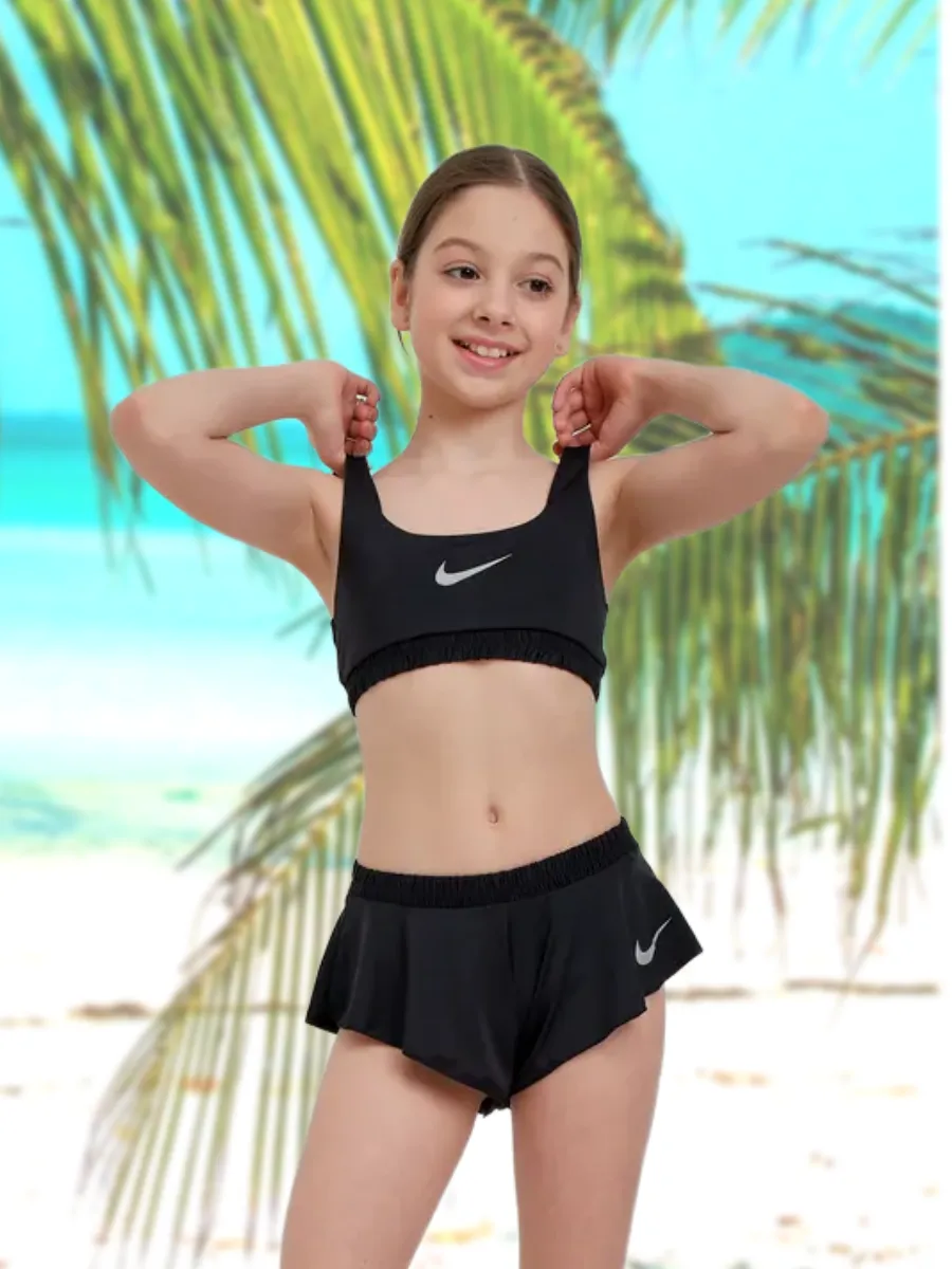 Представляем универсальный раздельный купальный костюм для активного отдыха, который станет идеальным выбором для девочек и подростка. Этот спортивный комплект в элегантном черном цвете с узнаваемым логотипом Nike обеспечивает не только стильный вид, но и максимальный комфорт.