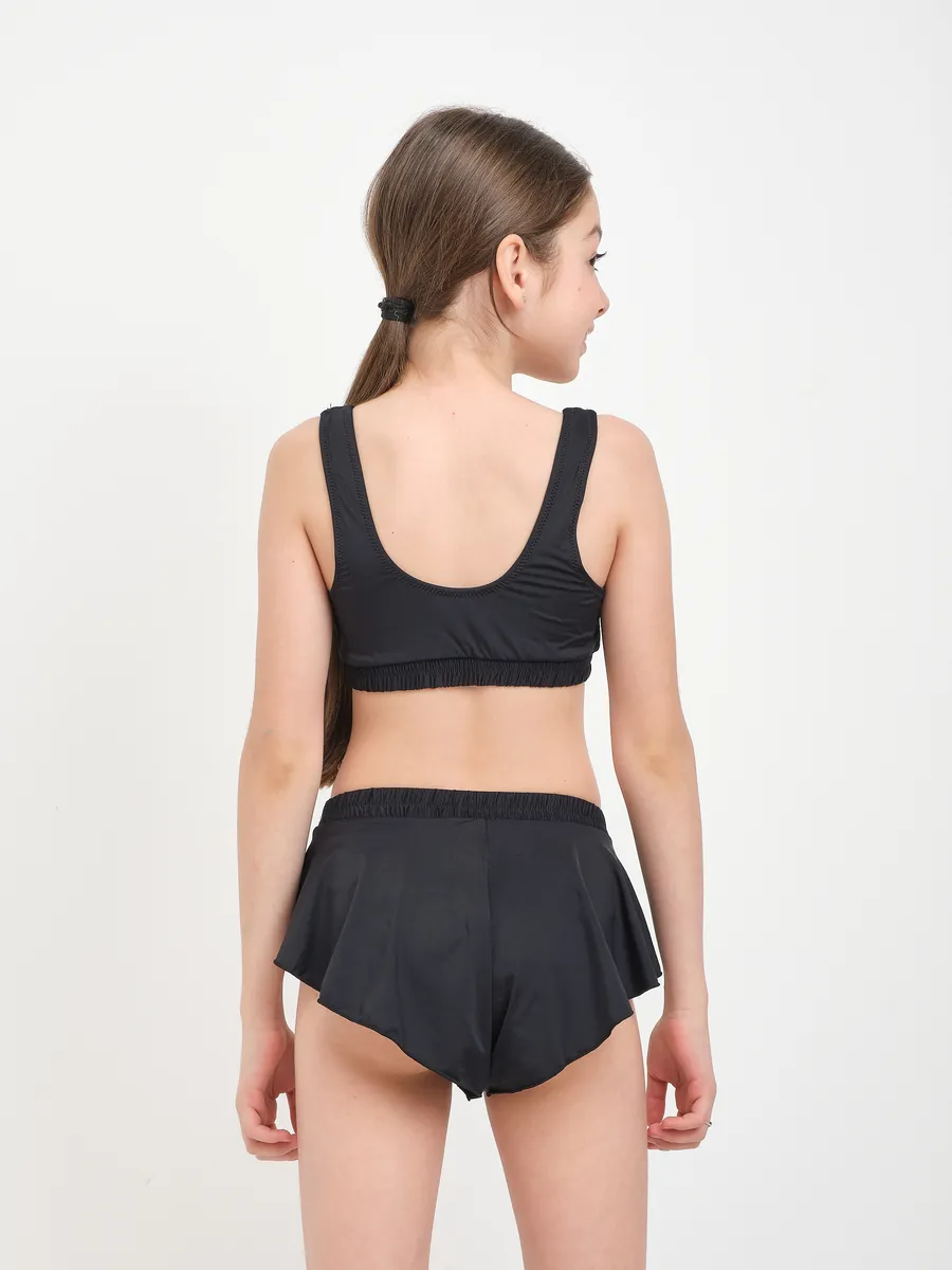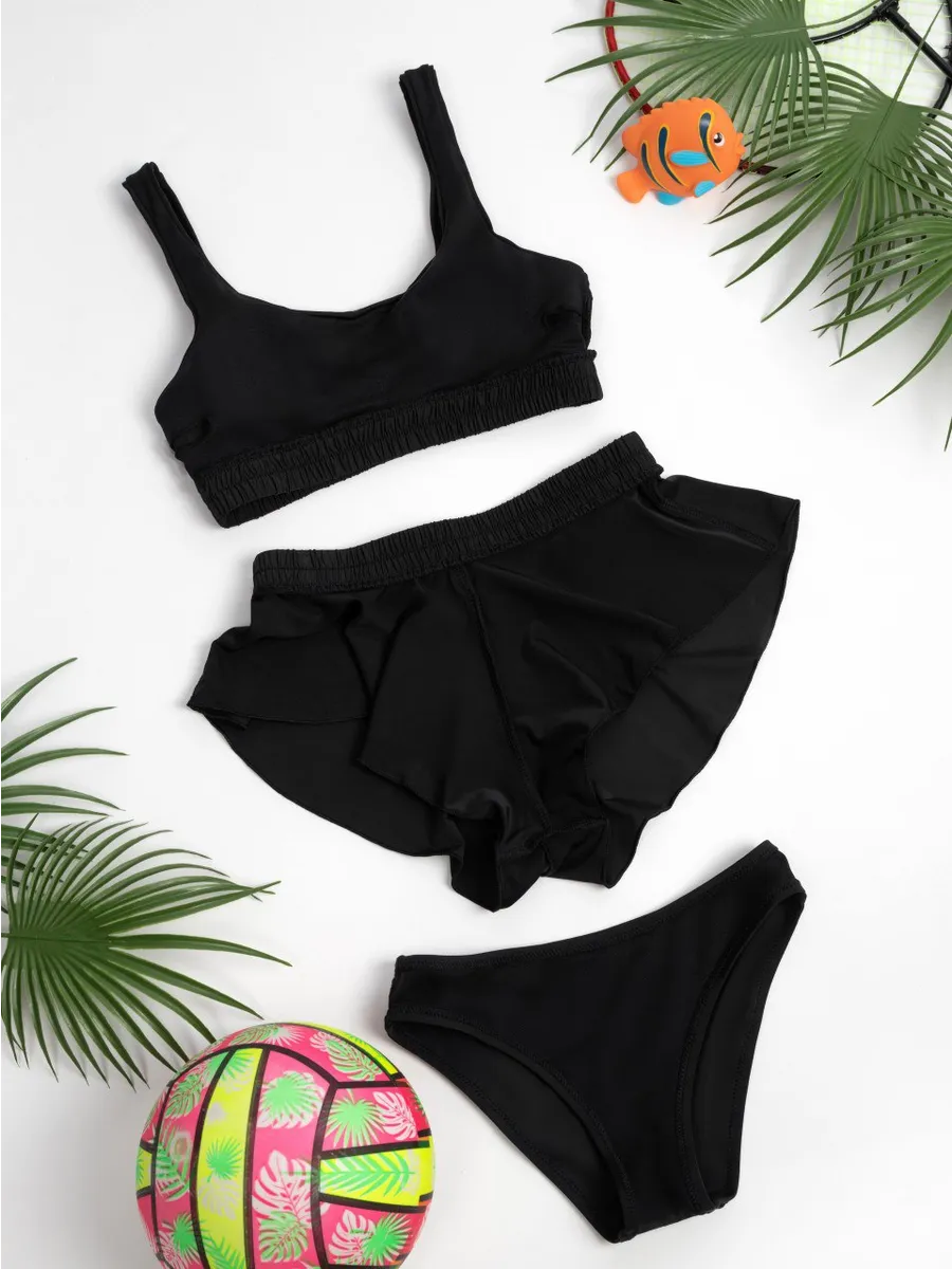 Вместо традиционных плавок или плавочек, комплект включает в себя стильные шорты, выполненные с внутренними шортиками для дополнительного комфорта и уверенности. Их многослойный дизайн с легким воланом по краю создает эффект модной мини-юбки, что делает этот раздельный комплект по-настоящему универсальным решением "три в одном" для разнообразных активностей. Это не просто трусы, а полноценные, комфортные шорты для активных занятий.