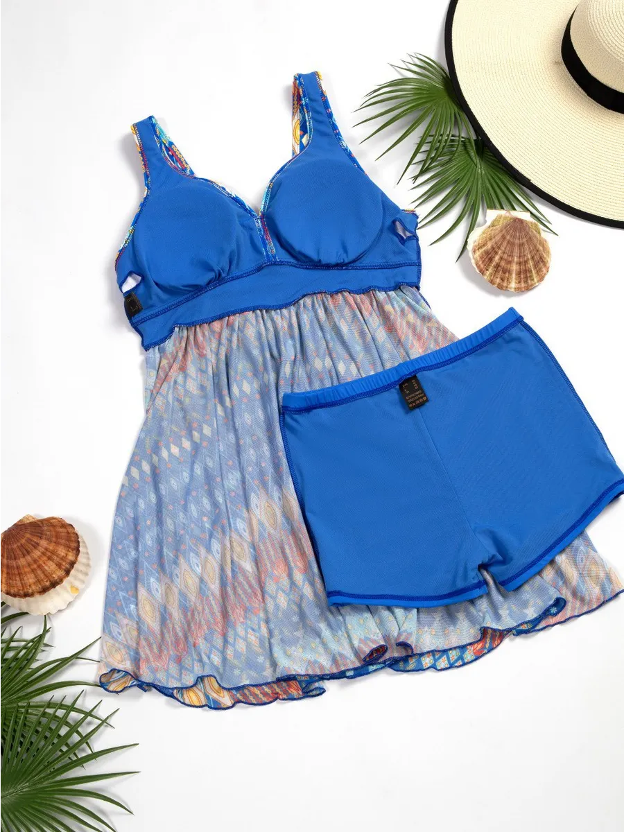 Раздельный фасон состоит из удлинённого топа в виде майки и удобных шорт. Такой купальник для полной женщины не сковывает движения, отлично подходит для плавания, активного отдыха и прогулок по пляжу.