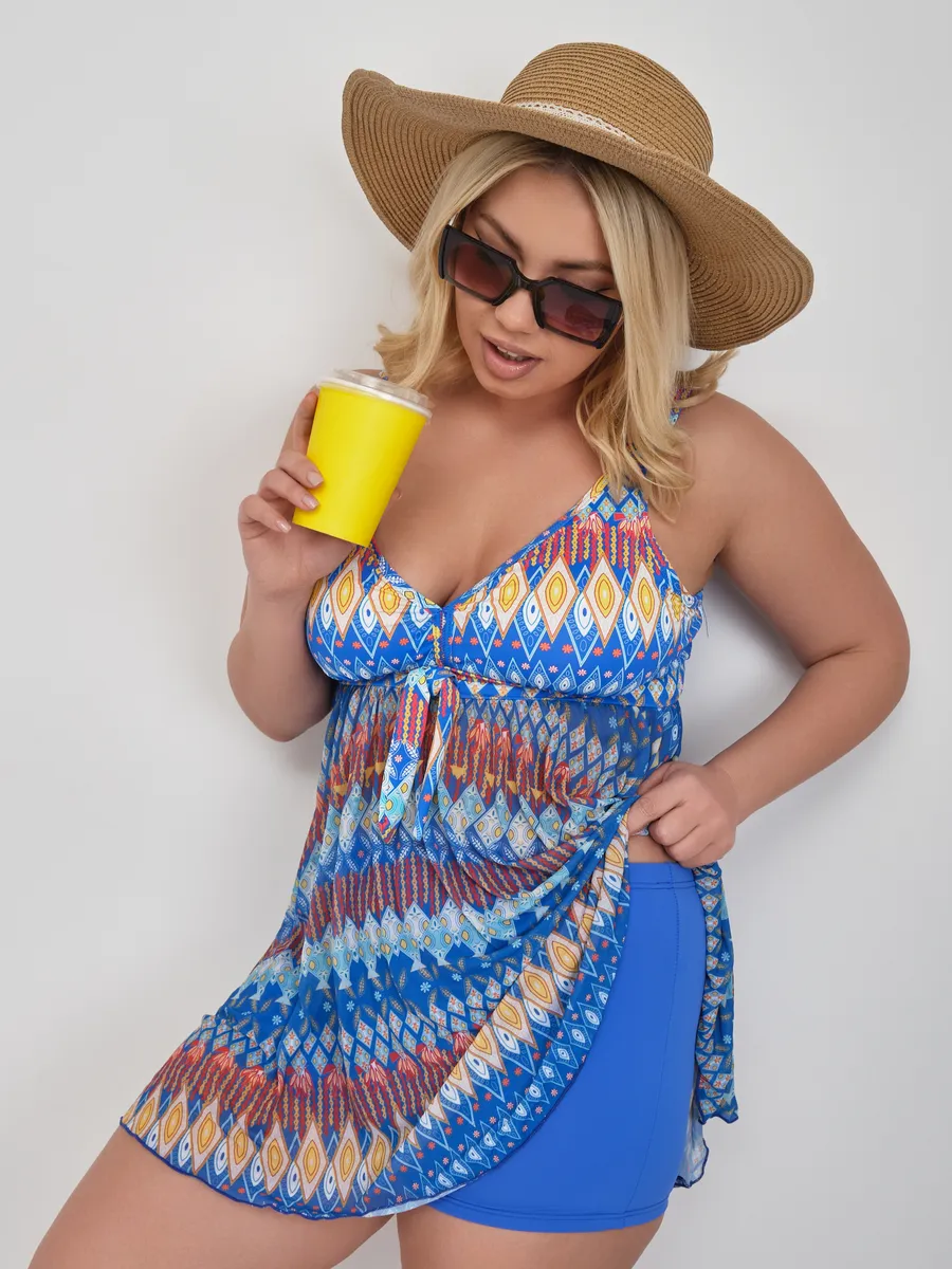 Стильный женский купальник танкини больших размеров с шортами идеален для полной фигуры и большой груди. Удобный раздельный фасон , скрывает живот и подчеркивает талию. Подходит для пляжа, моря, бассейна , отпуска и активного отдыха.